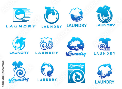 A set of laundry icons depicting washing machines detergents and various clothing items