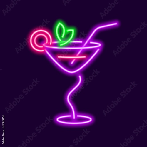 Neon sign of a cocktail glass with a straw and ice is glowing on a black background