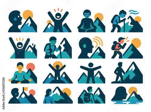 mountain emotions and experiences modern flat style. awe, excitement, peace, fatigue, joy, determination, focus, thrill, calmness, achievement, freedom, wonder, challenge