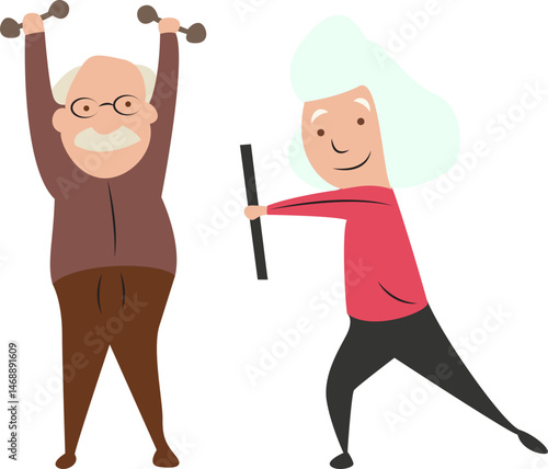 An active elderly woman with gray hair in a pink tank top confidently lifts blue dumbbells in a strength training pose, rendered in cheerful flat vector style great for senior fitness, healthy lifesty