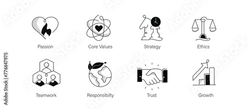 Business Core Values. Corporate values, cultural ethos, ethical standards, guiding principles, organizational culture. Icon Set with Passion, Ethics, Goals, Growth, and More. Editable Stroke.