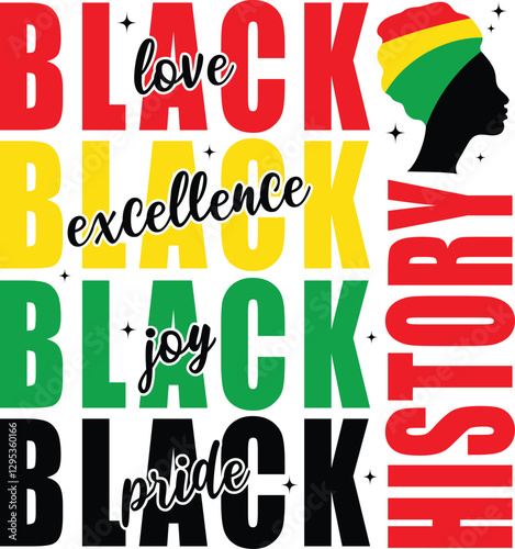 Black History Month design, Vector African American History Designs featuring bold typography in red, yellow, green, and black, celebrating love, excellence, joy, and pride. Includes an African woman