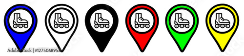 Flat map point icons for rollerdrome, inline skating places, inline skate rental shops, in different colors, location icons set on transparent background. Position symbols or GPS positioning
