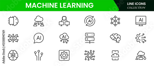 Artificial intelligence set of web icons inline style. AI technology icons for web and mobile apps. Machine learning, digital AI technology, algorithms, smart robotics, cloud computing network.