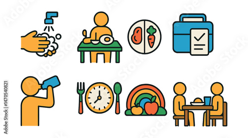 Flat vector icons of food habits and routines: washing hands, sitting at the table, portion control, lunchbox checklist, drinking water, slow eating clock, food rainbow guide, family meal setting.