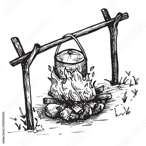 bonfire to boil water hand drawn illustration | hand drawn outdoor adventure in the mountain forest⁠