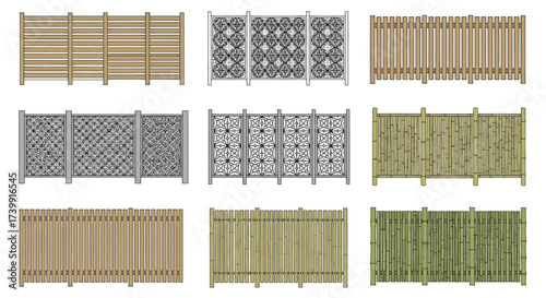 Collection of various fence designs including wood metal and bamboo for garden and outdoor use.