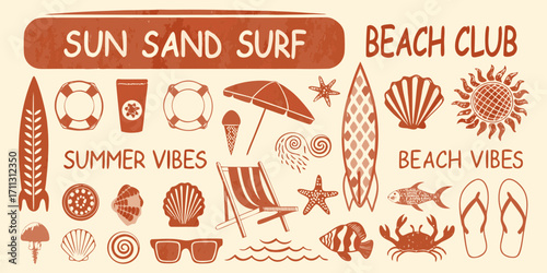 Collection of hand-drawn summer beach icons and symbols, featuring a beach umbrella, surfboards, a lifebuoy, a beach ball, waves, sunglasses, flip-flops, a palm tree, the sun, and clouds, all