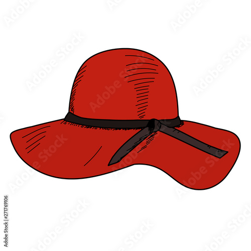 Women's hat with brim and ribbon isolated on white background. A headpiece for protection from the bright sun in a boho style. Flat vector hand drawn colorful illustration in boho style.