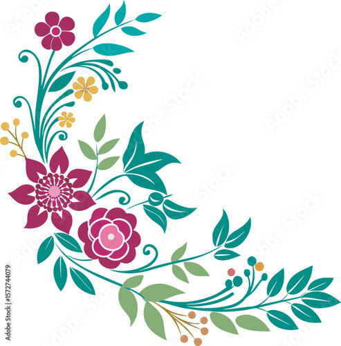 Vibrant botanical illustration capturing a lush, stylized garden with an array of blooming flowers and diverse green foliage, perfect for celebrating nature's beauty and renewal