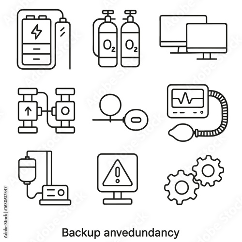Backup Icons Collection. Outline style icons of Backup and Redundancy: battery pack icon, dual oxygen source, secondary monitor,