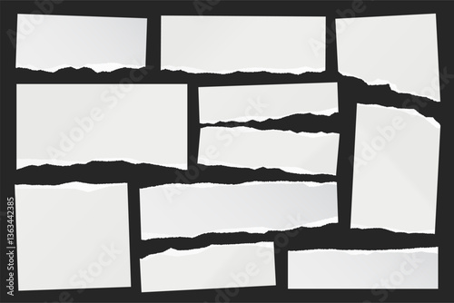 Ripped paper sheet. Black torn paper pieces. Collage blank, sharped torned notebook effect. Strip texture edge. Decorative note rough, jagged rips tape for text. Vector set