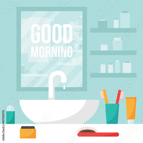 Bathroom or Washroom Interior with Bathtub, Wash Basin and Mirror with Objects for Personal Hygiene Vector Set