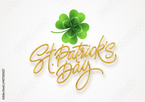 Golden realistic lettering Happy St. Patricks Day and realistic clover leaf. Design element for poster, banner Happy Patrick. Vector illustration