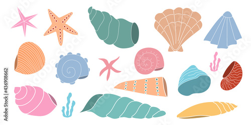 Set of bright varied seashells on an isolated background. Flat vector illustration.