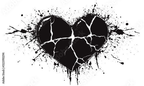 Grunge cracked heart with paint splatter in black and white - vector, flat icons set.