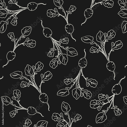 seth doodle seamless pattern with radish on a black background with white lines. Vector spring background for a seedling store