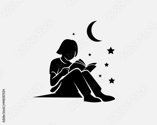 silhouette child reading book under tree reaching dream logo template illustration inspiration