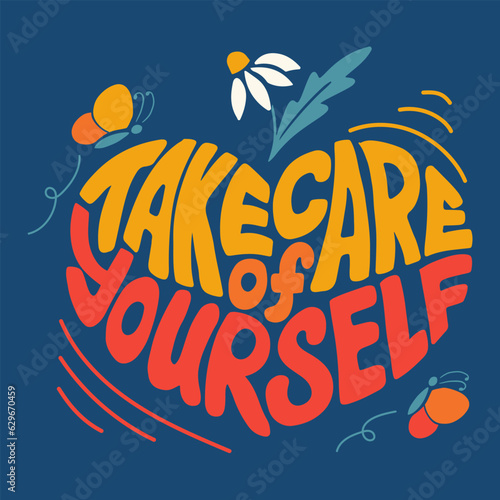Selflove motivating retro groovy typographic composition. Slogan Take Care Of Yourself in heart shape with flowerand butterflies. Treindy hand drawn print design for posters, tshirt, social media