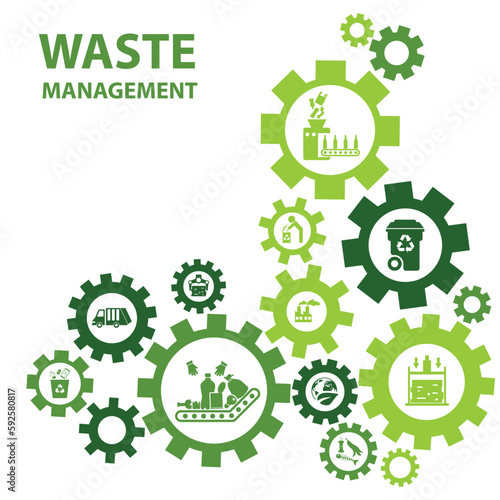 Waste management and recycling vector illustration. Green concept with icons related to sorting and separating different garbage or rubbish types