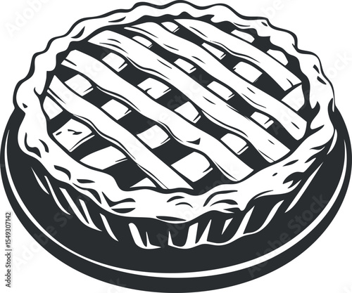 Black and white illustration of a round lattice crust pie on a plate, representing baked dessert food