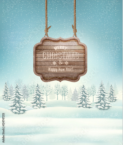 Merry Christmas Typographical on blue winter Christmas background with snowflakes, landscape, stars. Xmas and New Year card. Vector Illustration