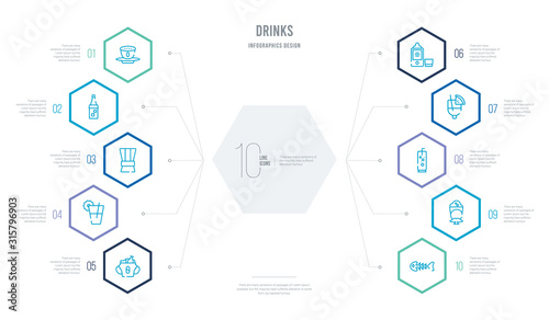 drinks concept business infographic design with 10 hexagon options. outline icons such as fish skeleton, frappuccino, fresh soda with lemon slice and straw, fruit juice, herbal liquor, ice tea
