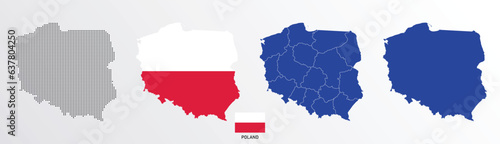 Set of political maps of Poland with regions isolated and flag on white background. Poland map blue color vector illustration.