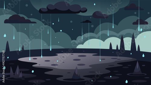 Tropical Rainy Beach. Vector illustration of calm tropical rain shower on the beach with umbrellas, puddles, and wet sand glow