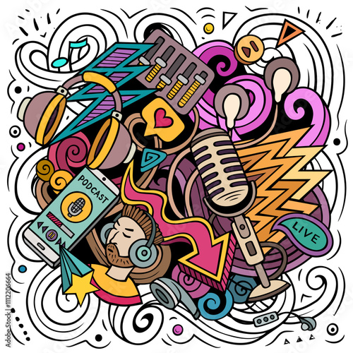 Audio content cartoon doodles illustration. Creative funny vector background. Podcasts, audiobooks, radio symbols, elements and objects