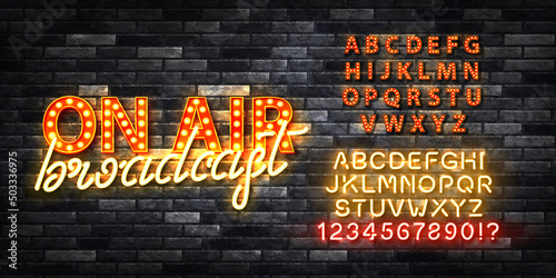 Vector realistic isolated retro marquee neon billboard with electric light lamps of On Air Broadcast logo with easy to change color alphabet font on the wall background.
