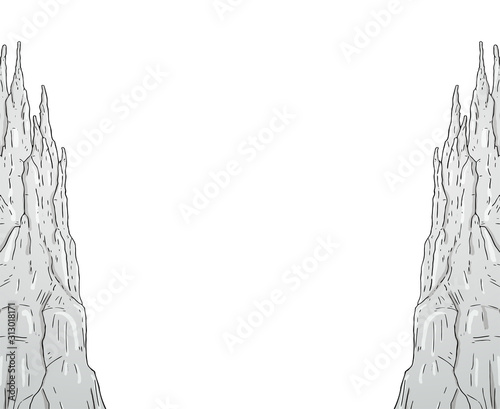 Flat rock mountains relief. Snowy cliff, mountain and hill. Isolated rocky peak, cartoon canyon silhouette. Racy vector nature hiking elements