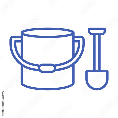 Símbolo vacaciones en la playa. Icono plano cubo de arena con pala en espacio negativo en fondo gris y fondo blanco