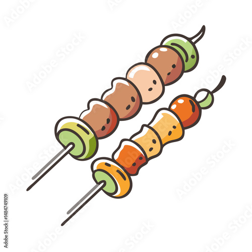 two skewers of grilled meat and vegetables, cartoon style barbecue food illustration