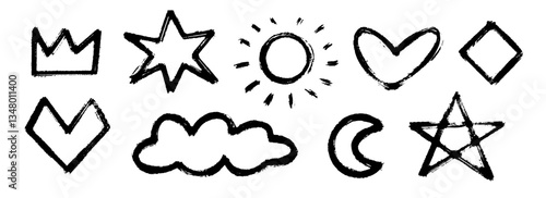 Black charcoal hand drawn shape set. Paint brush scribbled element collection. Pencil doodled childish sign and symbols. Rough sketched crayon cloud, star, heart, crown, sun, crescent. Vector