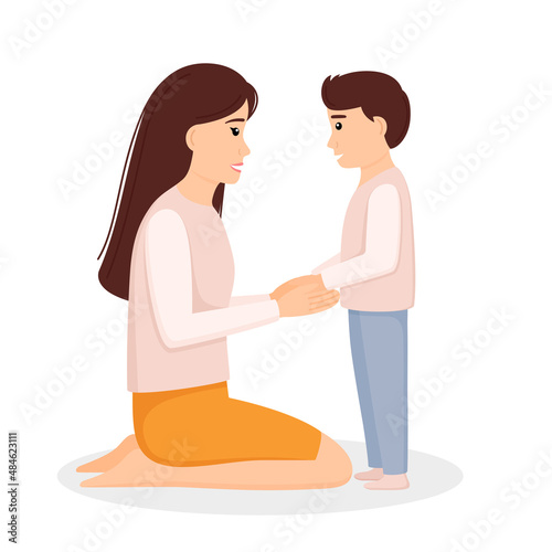Domestic violence. Angry mother, sad boy. Bullying and abusing behavior. Woman scream on son vector illustration. Son and mother conflict, kid crying and exhausted