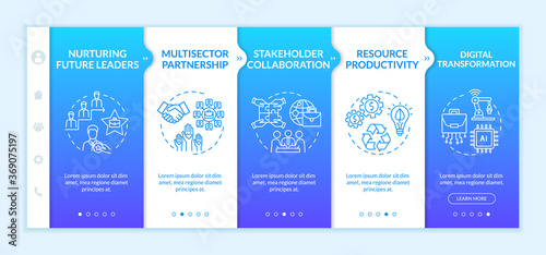 Steps of stakeholder relations blue onboarding mobile app screen. Walkthrough 4 steps graphic instructions pages with linear concepts. UI, UX, GUI template. Myriad Pro-Bold, Regular fonts used