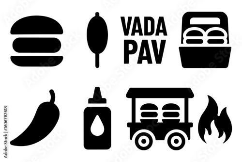 Street food icons: burger, corn dog, vada pav, and more in bold silhouette style