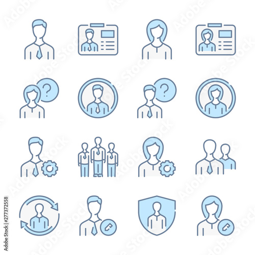 User profile action icon set illustration, identity verification search communication symbols, account security management concepts, social interaction feedback, outline flat vector