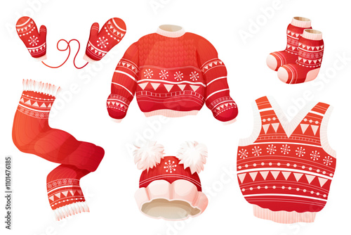 Winter clothes and cold weather accessories isolated on white background. Vector knitted hats and scarves, mittens and woolen socks