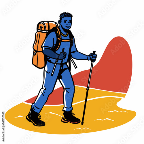 walking man with walking stick,silhouette of a person hiking,illustration of hiker with trekking pole,black and white icon of a trekker,minimalist graphic design of a walker.