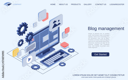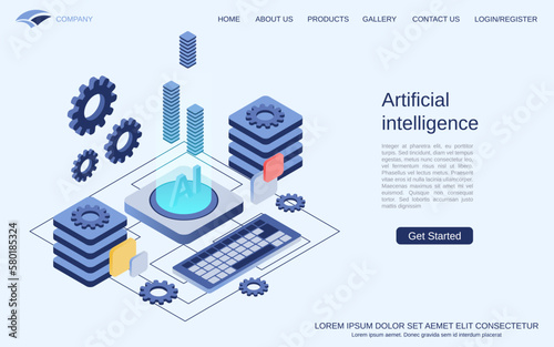 3D printing process landing page website template. Vector isometric industrial 3d printer printing house. Technology of manufacturing and prototype.