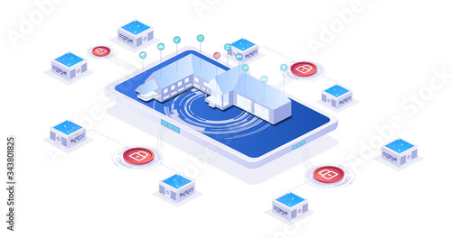 5g mobile phone with IoT app, flat vector isometric illustration. Internet of things, smart home technologies. 5g cellular network connecting machines, objects and devices.