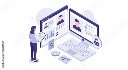 5G wifi high speed internet fllowchart, vector isometric illustration. Businessman looking at internet speed meter on laptop screen. Smartphone, satellite, router, data cloud.