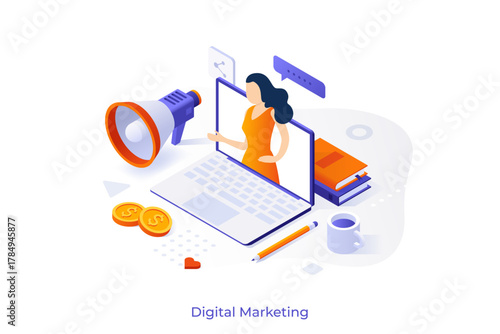 5G wifi high speed internet fllowchart, vector isometric illustration. Businessman looking at internet speed meter on laptop screen. Smartphone, satellite, router, data cloud.