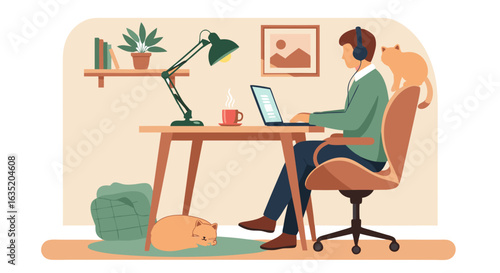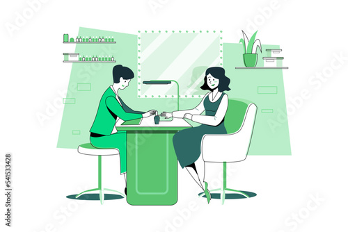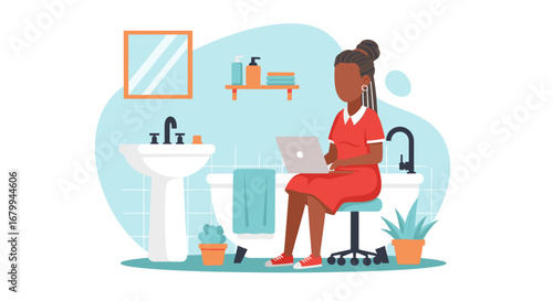 8 March, Womens Day. Happy woman enjoying her day off, having breakfast in the morning at home, flat vector illustration. Cute girl sitting at table, eating and drinking coffee. Happy holiday.