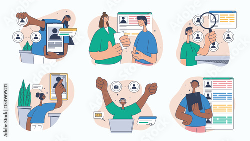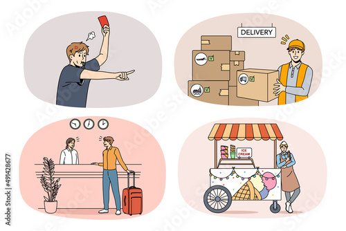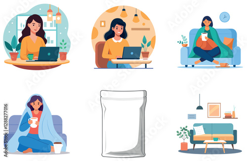 8 March, Womens Day set, flat vector isolated illustration. Happy women spending day off at clothing store, fashion boutique, spa, beauty hair salon and at home training practicing yoga. Happy holiday