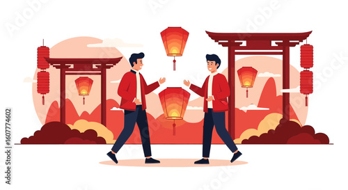 Young couple with newborn baby, huge hourglass, middle aged and old male characters, flat vector illustration. Aging process, lifespan, generation, human life cycle from infancy to senior years.