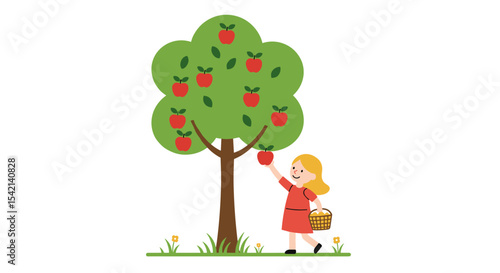 AI robot agronomist harvesting in garden picking ripe fruit from tree vector illustration. Automated farm life, horticulture and crop cultivation concept