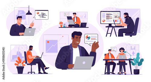 Artificial intelligence vector landing page. Teamwork on futuristic laboratory with high technology illustration. Virtual reality for deep learning and successful business financial strategy concept